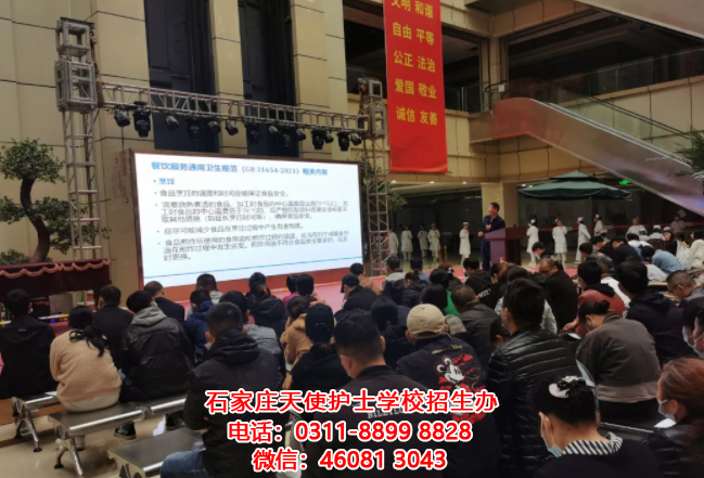 石家莊天使護士學校邀請石家莊市市場監(jiān)督管理局公共衛(wèi)生主任醫(yī)師徐瑋在學校C座一樓大廳舉辦了以落實疫情防控,確保校園食品安全為主題的教育講座。參加此次培訓(xùn)的有學校安全法制辦公室、各班班主任、各班“健康天使”和食堂工作人員共計200余人。